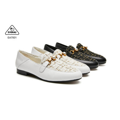 【中国仓】EVERAU EA7001秋冬新款 牛皮+格纹花呢布女士羊毛内里乐福鞋