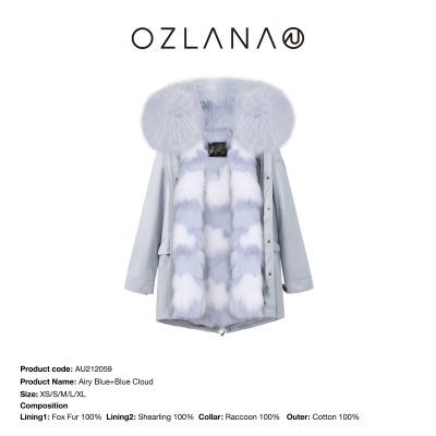 【中国仓】【OZLANA 皮草大衣派克服】AU212059 雾霾蓝+蓝色云朵狐狸毛