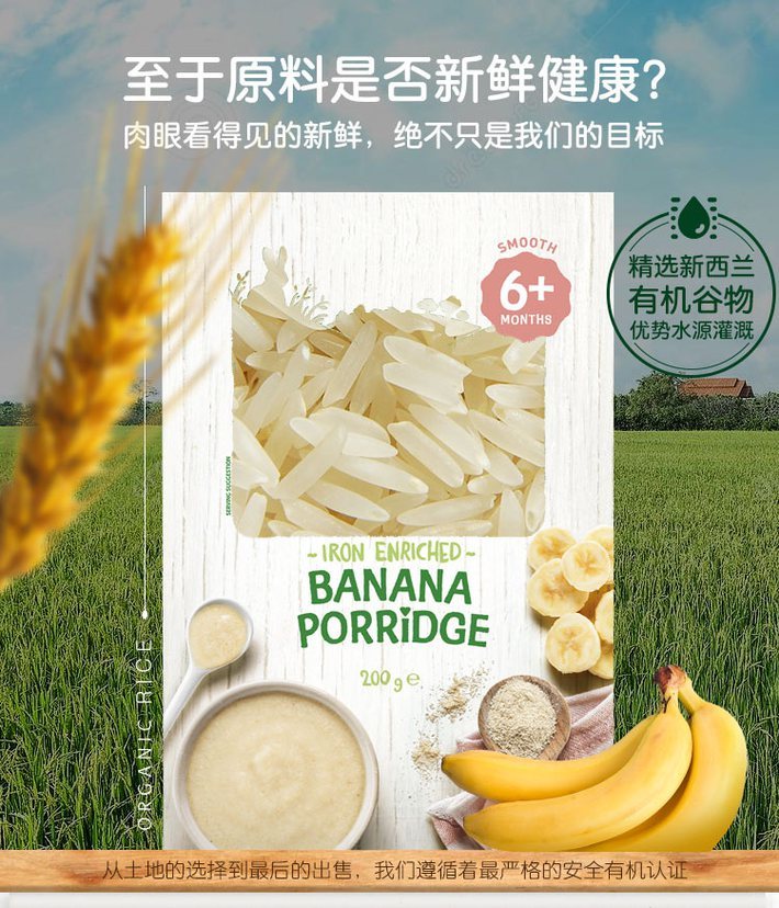 成分:以有机认证的燕麦作为主要成分,添加丰富的矿物质(铁)及香蕉片