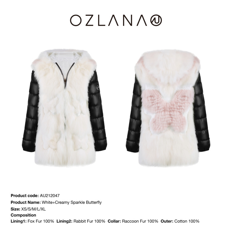 【中国仓】【OZLANA 皮草大衣派克服】AU212047 白色+奶茶蝴蝶狐狸毛
