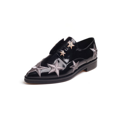 刺绣与皮鞋面的完美碰撞 之 星星的鞋面刺绣图案 搭配金色金属水晶钻扣不对称设计 略显中性 又不失女性的柔美