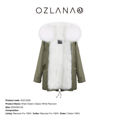 【中国仓】【OZLANA 皮草大衣派克服】AU212032 军绿色+经典白色貉子毛
